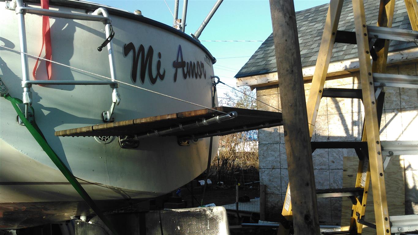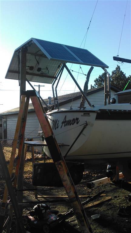 I redid my solar platform, moved it back farther behind the stays. I also put an angle on it so it looked smaller. I can tip them up if needed. I will have to wait a few more weeks to fiberglass it all together. Also there is a pic of my swim or boarding platform. I had filled in the motor well when I did the refit. I reused the stanchions and some bamboo planks. The best part of the whole boat makes boarding from the kayak a breeze.