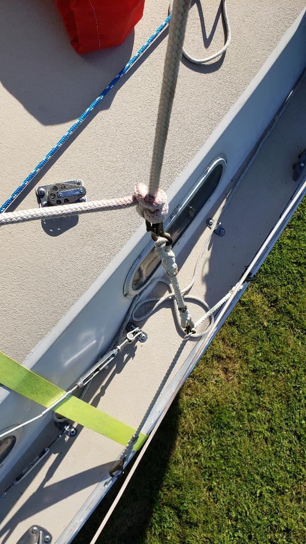 Here are additional pics (3-5) of support and other rigging. Really important to use 4 tie down ratchet straps to ensure the stern support holding the mast does not tip over (it wants to!).