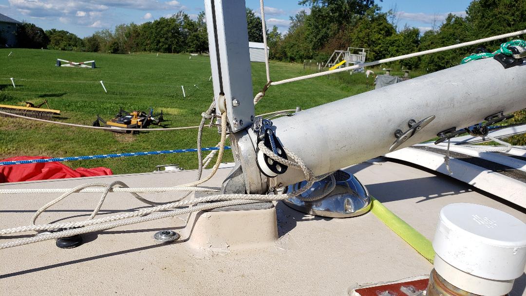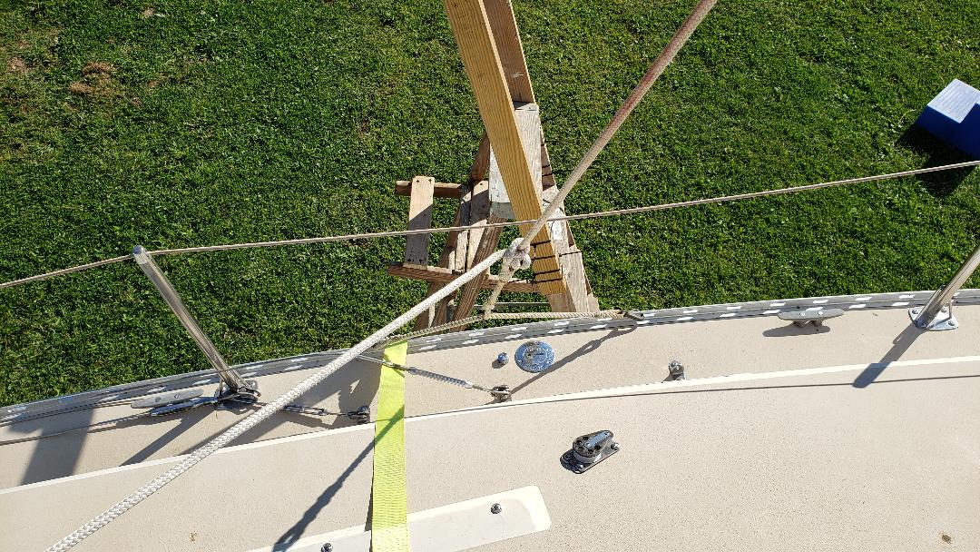 Just a note, you say you have to work the roller reef as you raise the mast. I use 1/8 cable bridals ,ratchet straps on a piece of dedicated thick wall electrical conduit with eye bolts (heavy duty) , this way I never take the mainsail off the boom. Instead of the jib halyard I use the forestry to pull up the mast. If you have a flexible curler track you should be able to use that just as I do. If your forestry track is rigid you might have trouble with it bending at the joints until you get everything under tension. I have used this method with just a wire forestry and a rigid furler without problems. I know all the documents suggest the halyard for raising the mast but I feel much more secure using the wire forestry. Just my personal feelings on the matter