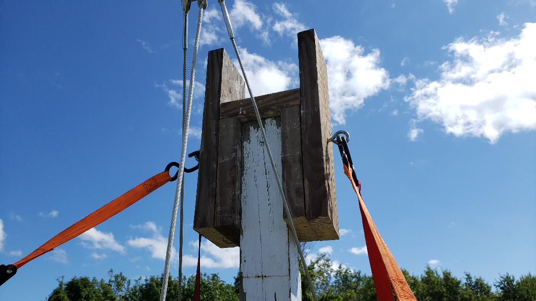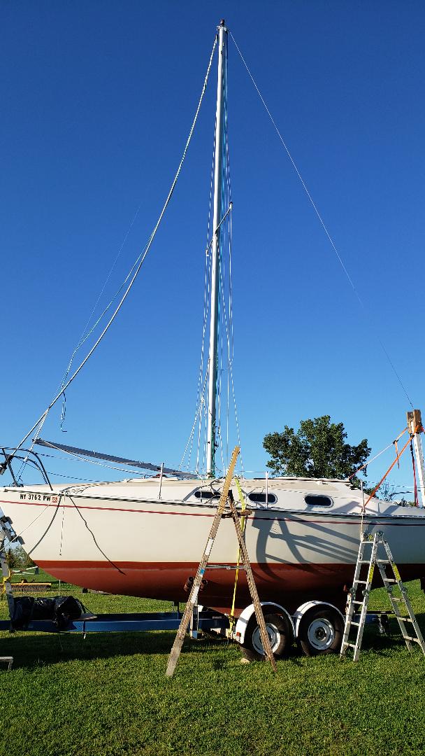 Finally got around to posting these images of mast raising on my C26. Took me a while to figure out how to get the mast supported properly on the stern in order to move it back far enough and get at the proper angle to ensure the mast went into the mast step hook properly. I ended up building a support that sits on the stern seat area in the cockpit. Hope these pics help someone. I followed the original instructions in the C26 manual to set up the rigging, hardest part was sorting out the support I needed. Was able to raise the mast with just my wife and son, their job was to make sure the mast did not go east / west (it has a tendancy to do that) while raising, and also ensuring the rope stayed attached with pressure to hold the mast base against the mast step hook (you don't want that falling out). I also ran the hoisting line back to the genoa winch on the starboaard side from a pully on the bow, that worked out great.