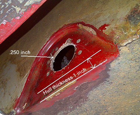 As for the thickness of the mounting location, I would be unwise to reinforce that area with wood or metal encapsulated in fiberglass below the waterline, If water was to get in, it would cause the wood to rot or the metal to rust