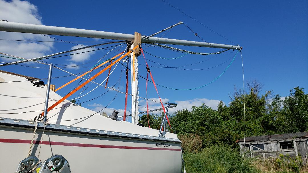 Just a note, you say you have to work the roller reef as you raise the mast. I use 1/8 cable bridals ,ratchet straps on a piece of dedicated thick wall electrical conduit with eye bolts (heavy duty) , this way I never take the mainsail off the boom. Instead of the jib halyard I use the forestry to pull up the mast. If you have a flexible curler track you should be able to use that just as I do. If your forestry track is rigid you might have trouble with it bending at the joints until you get everything under tension. I have used this method with just a wire forestry and a rigid furler without problems. I know all the documents suggest the halyard for raising the mast but I feel much more secure using the wire forestry. Just my personal feelings on the matter