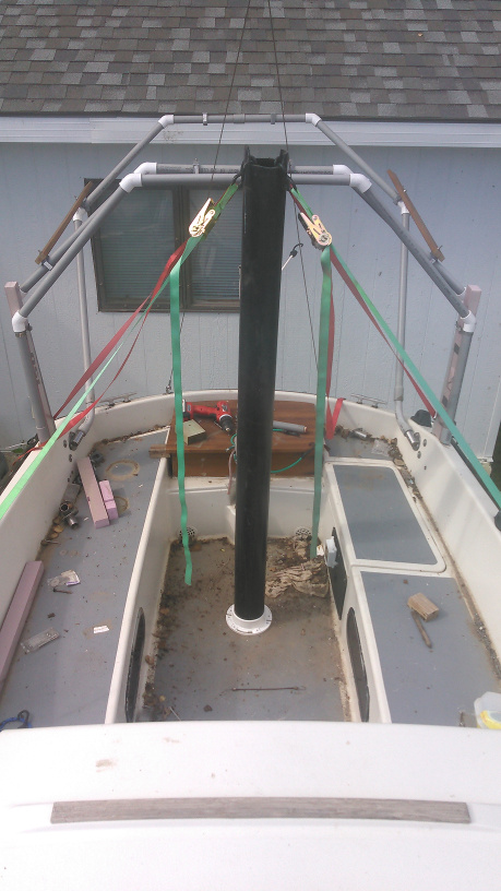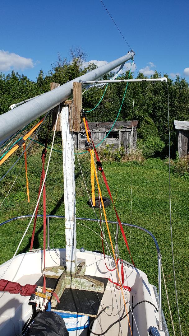 Finally got around to posting these images of mast raising on my C26. Took me a while to figure out how to get the mast supported properly on the stern in order to move it back far enough and get at the proper angle to ensure the mast went into the mast step hook properly. I ended up building a support that sits on the stern seat area in the cockpit. Hope these pics help someone. I followed the original instructions in the C26 manual to set up the rigging, hardest part was sorting out the support I needed. Was able to raise the mast with just my wife and son, their job was to make sure the mast did not go east / west (it has a tendancy to do that) while raising, and also ensuring the rope stayed attached with pressure to hold the mast base against the mast step hook (you don't want that falling out). I also ran the hoisting line back to the genoa winch on the starboaard side from a pully on the bow, that worked out great.