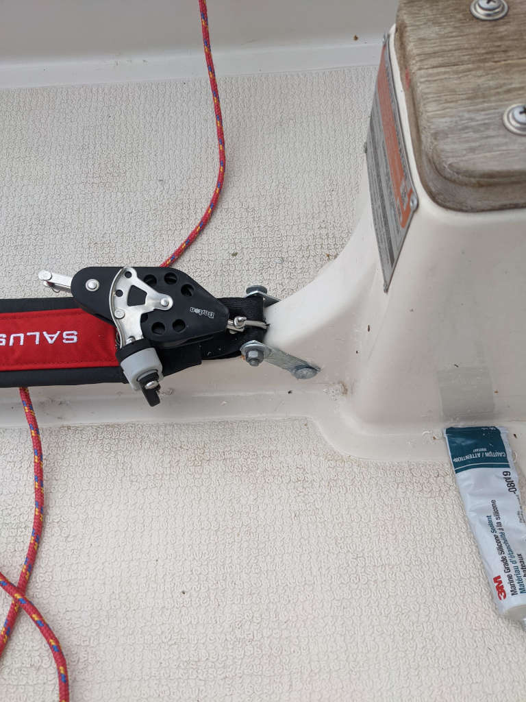 Template to mark holes: Drilled holes in my boat!!! Small slit cut in hiking strap to feed block swivel Galvanized steel bracket with a ton of silicone, and voila, deck block plus hiking strap