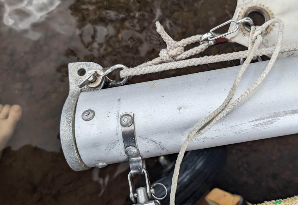 When I got my Pirateer it was missing a few parts, so I've had to improvise. The documenation on rigging the outhaul is very difficult to understand and the pictures, at least in my copy of the manual or pretty much useless.