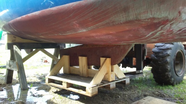 Using a forklift, we raised her off the forward end of the trailer, and set the stern first, then pulled the trailer and placed the forward bunk. This all went surprisingly well.