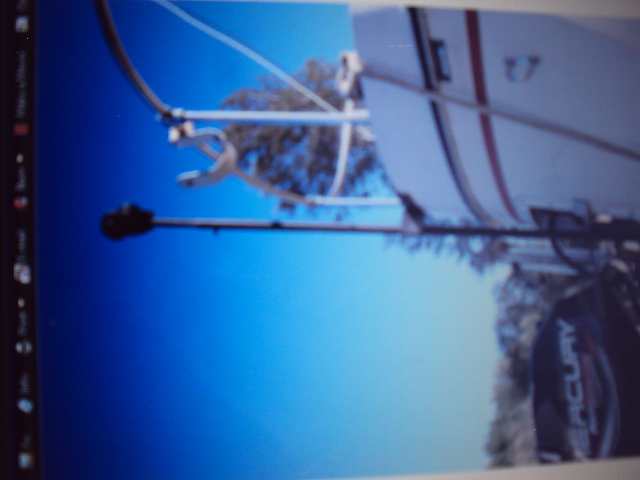 # 1 Is the mast crane made from a piece of pipe with a roller . The bottom of the rig just sits inside the motor mount. the pipe is welded to a channel that hooks over the transom with a cut out for the factory installed stern light. The channel was made from 2 pieces of angle bent and welded to match the curve of the transom. I put the roller on a scond pipe that sleeves into the base with a pin that allows for hieght adustment. This unitworks for trailering as well as set up. The roller allows me to slide the mast back untill I can attach the mast base to the step. The boat does not have the original step but uses a hinge pin. (IMOH Much safer)